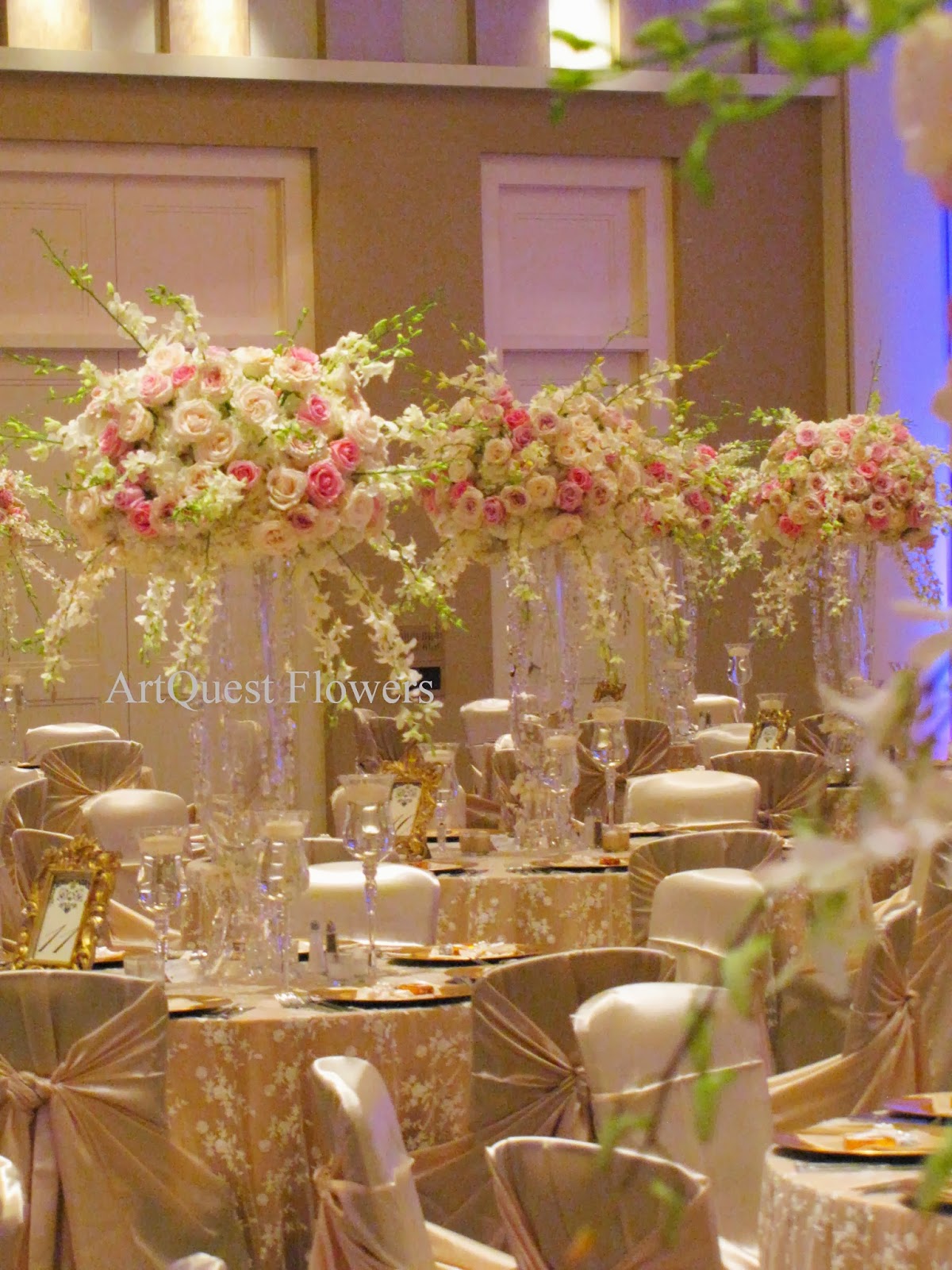 The ceremony had 4 lush tall arrangements overflowing with orchids,